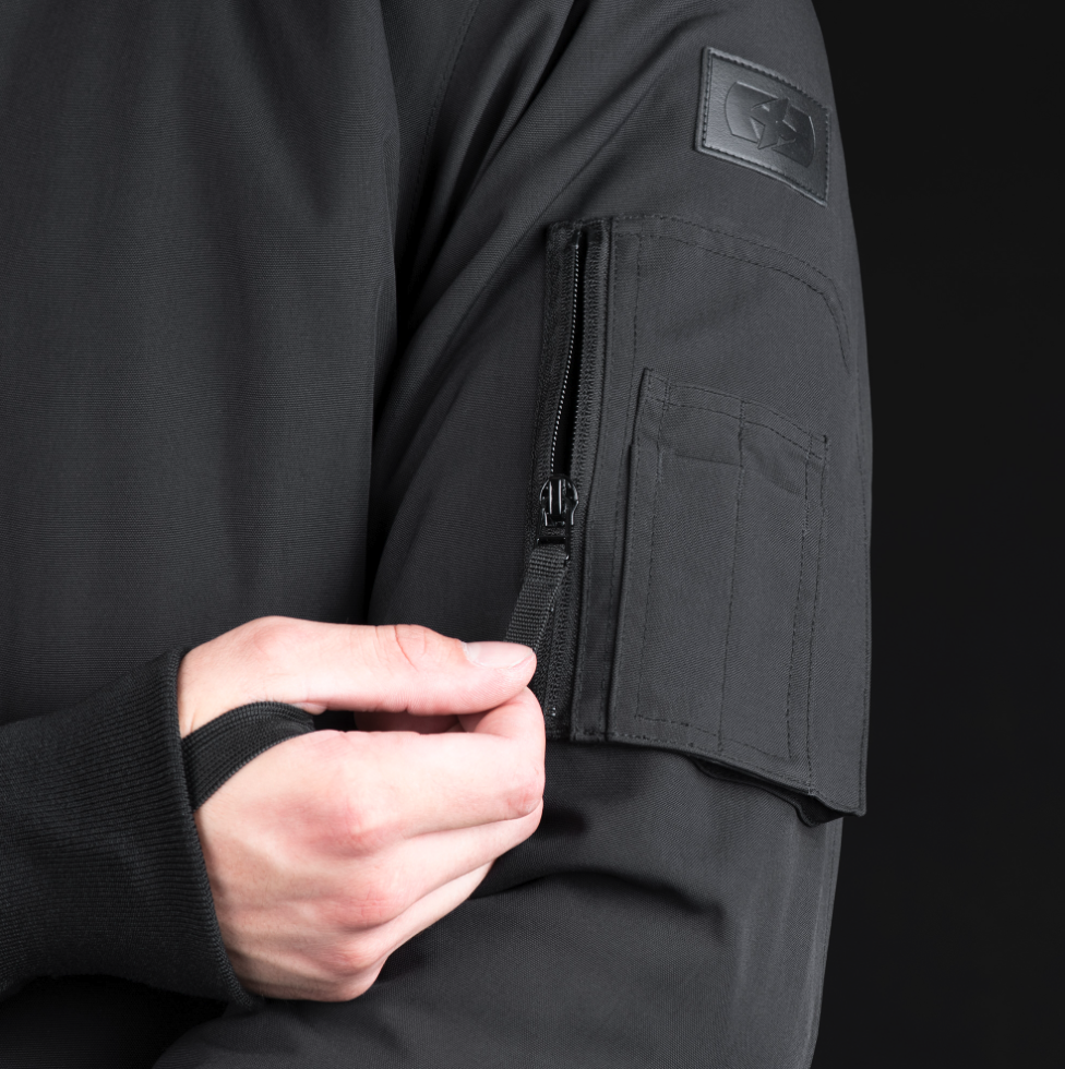 • Reflective sleeve branding and dark charcoal reflective strip down the back